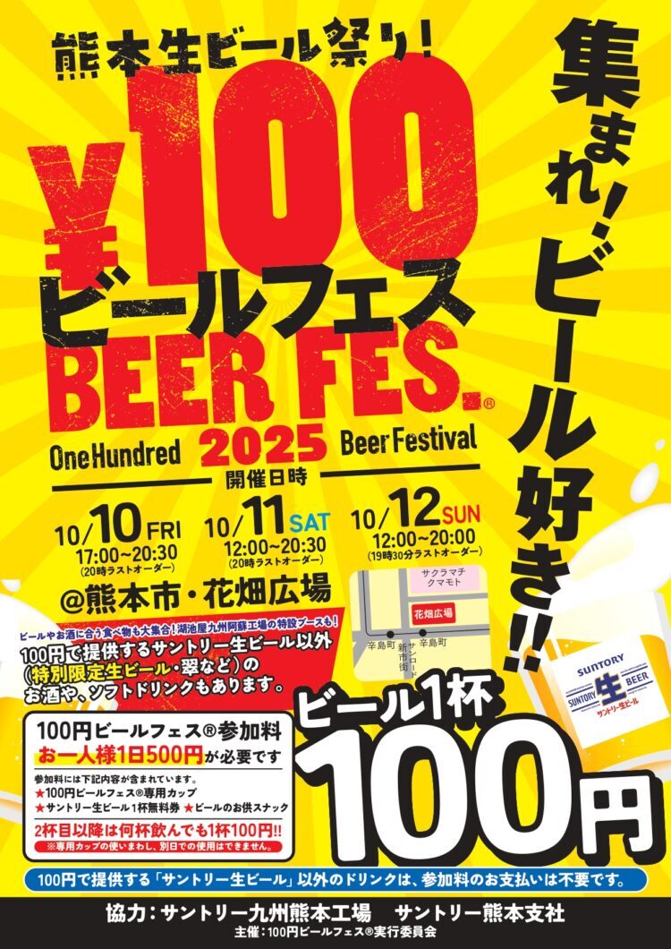 熊本の街なかで大人気の「100円ビールフェス2025」が今年も開催されます。会場は花畑広場で、サントリー生ビールをはじめ特別限定ビールや多彩なドリンクが一杯100円で味わえる夢のようなイベント。最初に専用カップを購入すれば、何杯でもお得に楽しめる仕組みです。週末の3日間は熊本の夜がビール色に染まり、友人や家族と乾杯する人々で大賑わい。気軽に立ち寄れて、美味しいフードや音楽と一緒に盛り上がれる、ビール好き必見のイベントです。