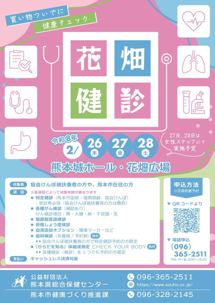 お買い物やお散歩のついでに立ち寄れる健診イベントとして開催される『花畑健診』。特定健診とがん検診を同時に受けられる機会として実施され、ご自身の体の状態を見つめ直すきっかけづくりをサポートします。ご家族やご友人と一緒に、気軽に健康チェックができる場です。